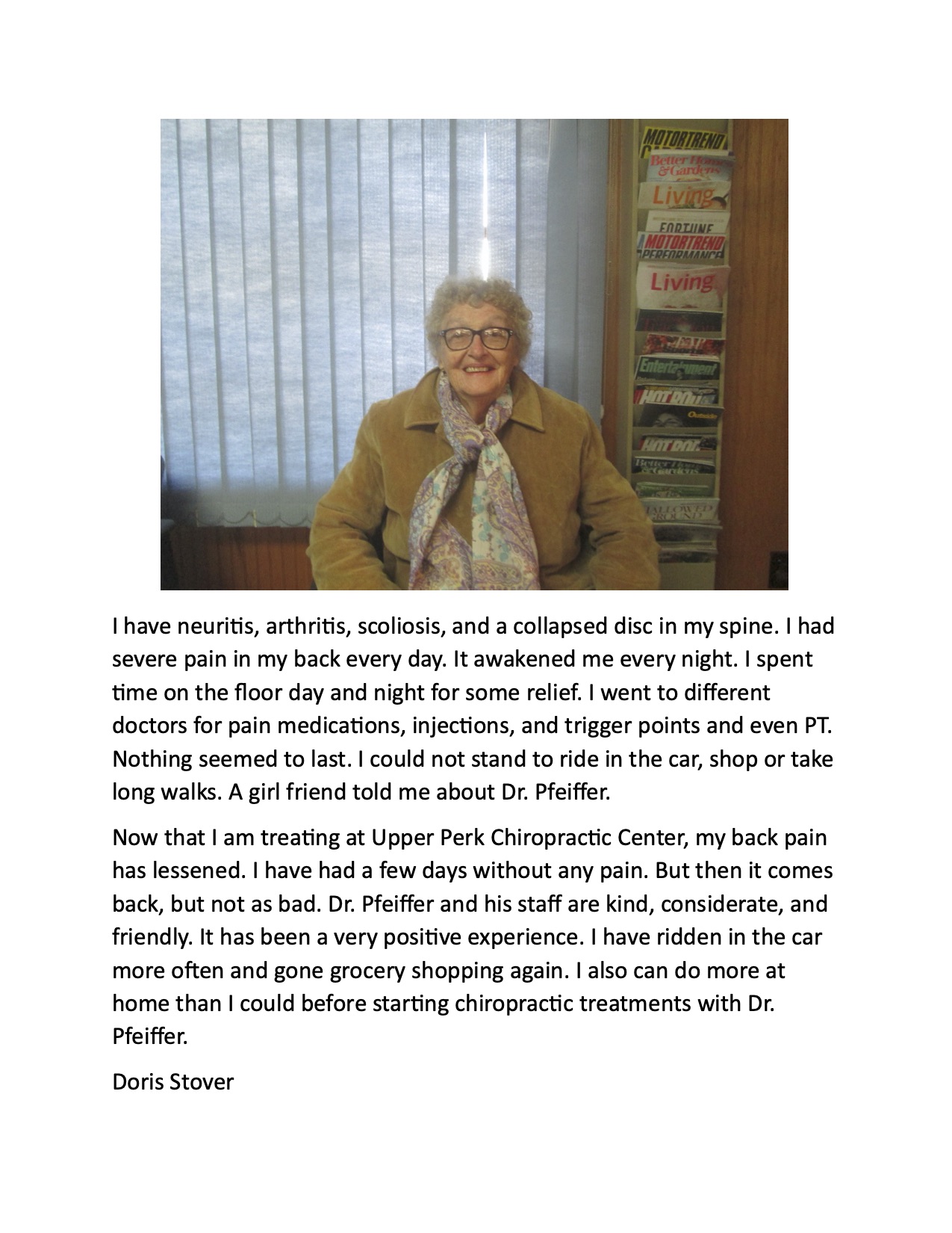 Click here to read Doris Stover’s story of how a chiropractic checkup helped her acheive some mobility even after years of decline.